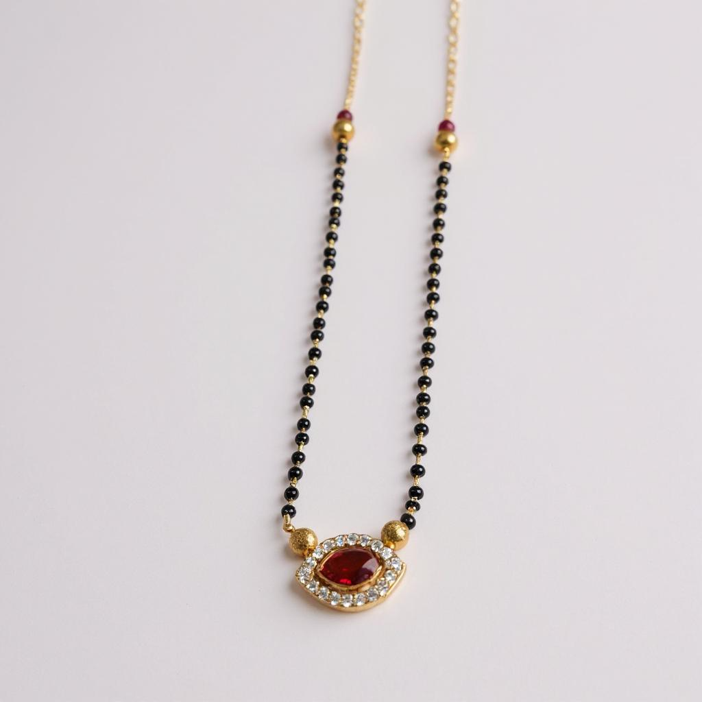 Classic Gold-Plated Ruby Pendant Mangalsutra with Black Beads – Indian Ethnic Jewelry