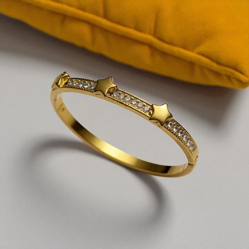 Bring a little starlight to your style with this starry gold bracelet, designed with a slim band and accented by sparkling crystal stones. The playful star motifs combined with dazzling CZ detailing make this bracelet a chic blend of elegance and charm.Perfect for casual outings, festive occasions, or as a thoughtful gift, this bracelet is lightweight, stylish, and versatile enough to match every look from western outfits to traditional wear.