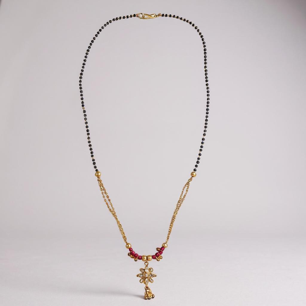 Celebrate the beauty of tradition with this stunning gold-plated floral mangalsutra. Designed with classic black beads, red bead accents, and a sparkling stone-studded floral pendant, it perfectly blends cultural charm with modern elegance. Lightweight and skin-friendly, this mangalsutra is ideal for daily wear or special occasions.